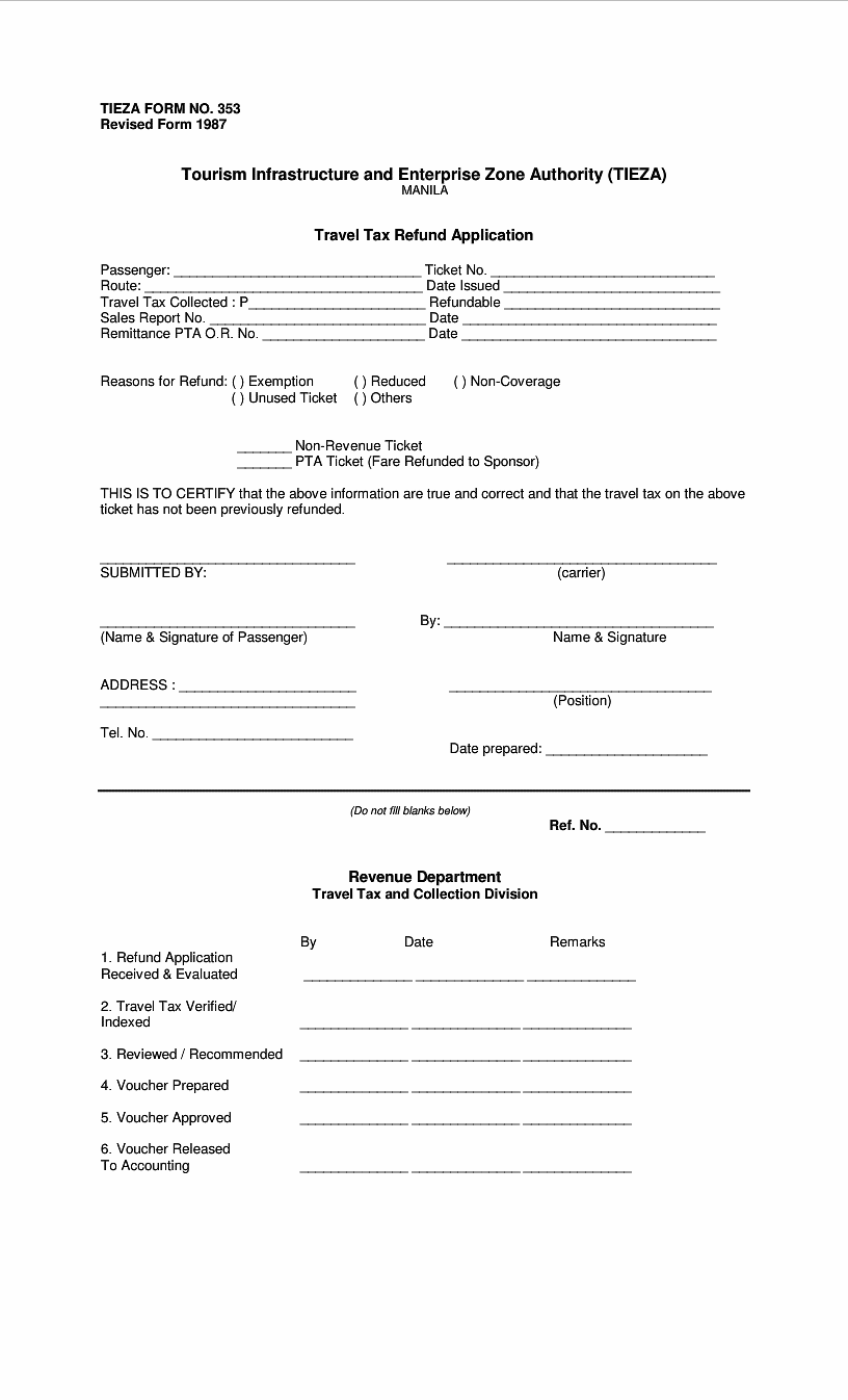 1) The first thing you need is the TIEZA Refund Application Form No. 353. Download it by clicking on the format you prefer. Then print it and fill in the form.
